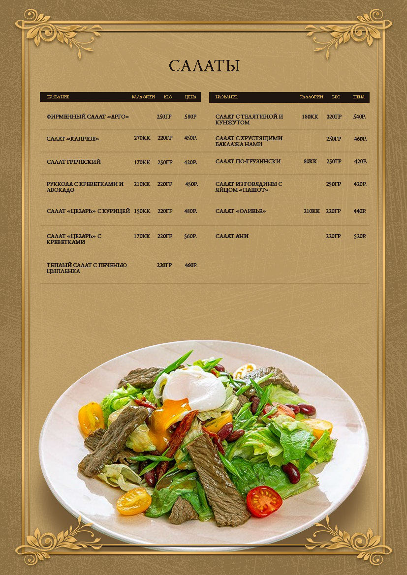 При создании обложки и меню для ресторана «Арго» акцент был сделан на атмосферности и стилистике заведения. Бежевые оттенки и фактура старинной бумаги создают ощущение теплоты и домашнего уюта, отражая традиционную кухню ресторана. Дизайн выдержан в лёгкой винтажной эстетике, что делает меню не только функциональным, но и визуально приятным элементом общего фирменного стиля.
