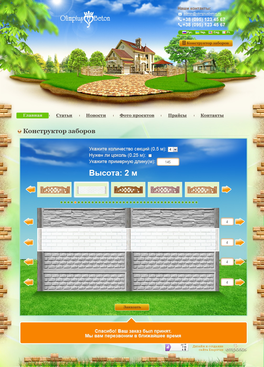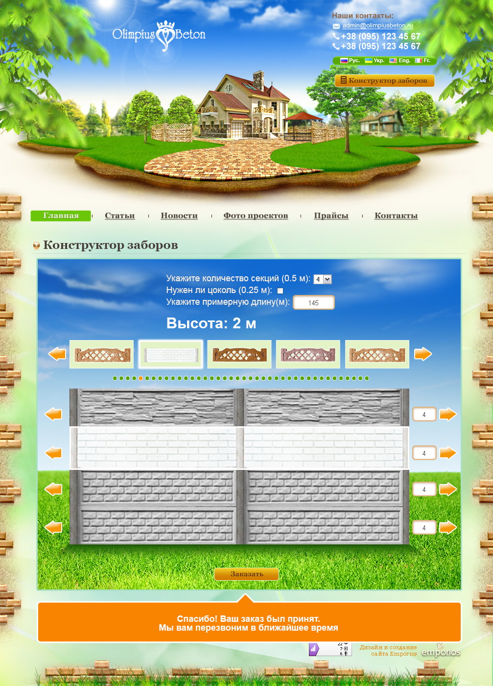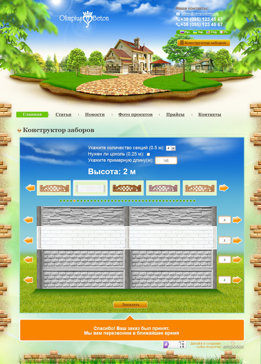 Также был сделан дизайн и программирования дополнительного модуля — конструктора подбора клиентом заборов онлайн.