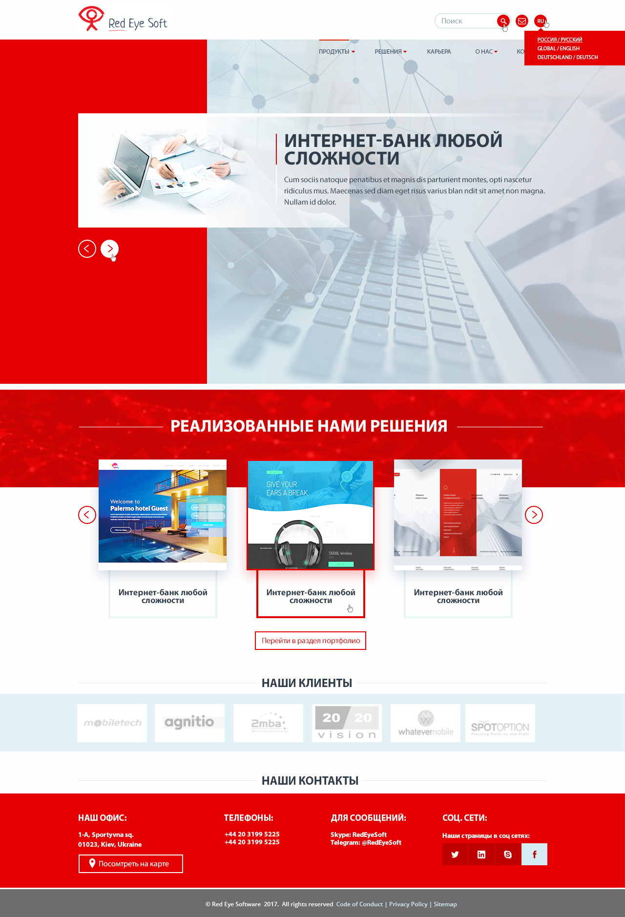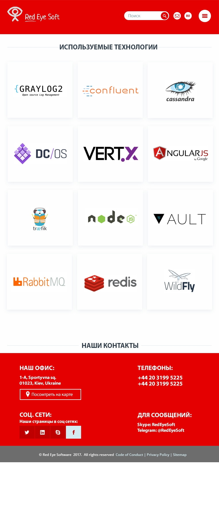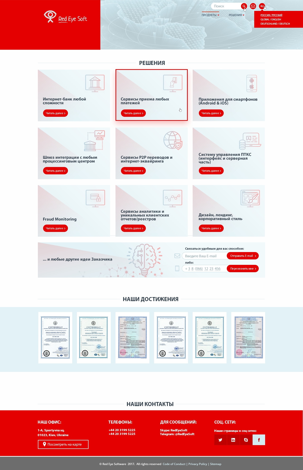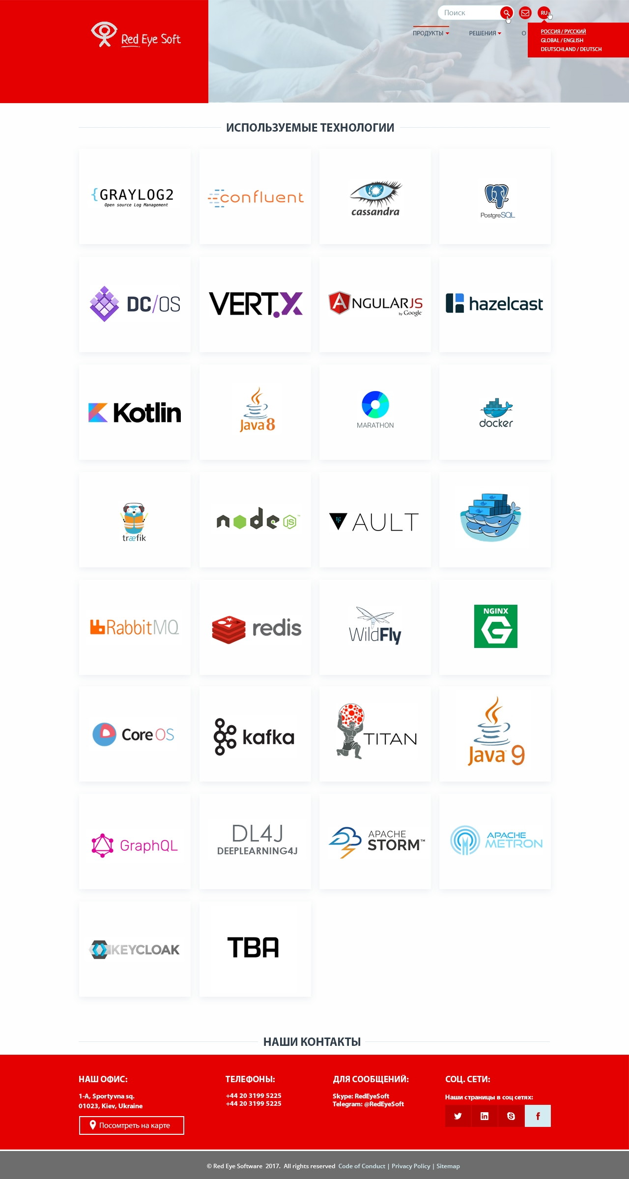 Интерфейс современный, акцентированный на технологиях, услугах и команде.