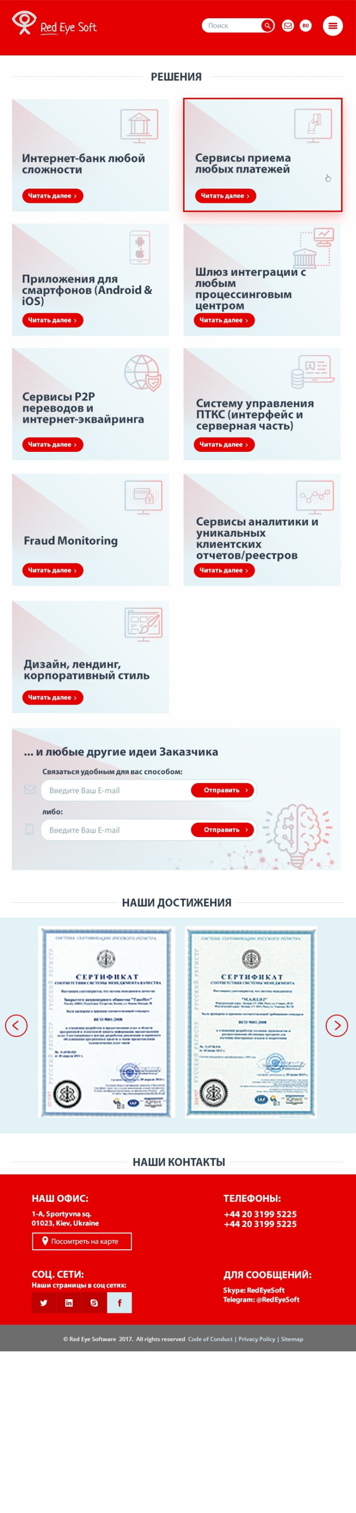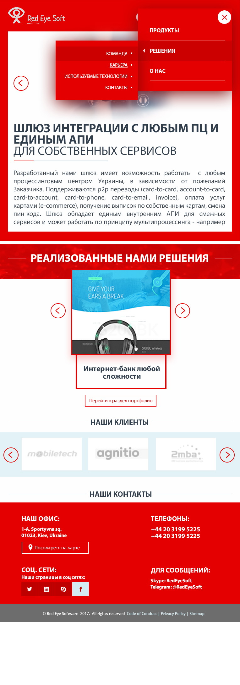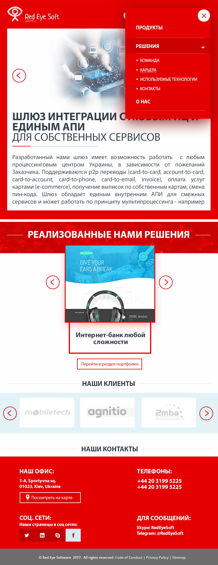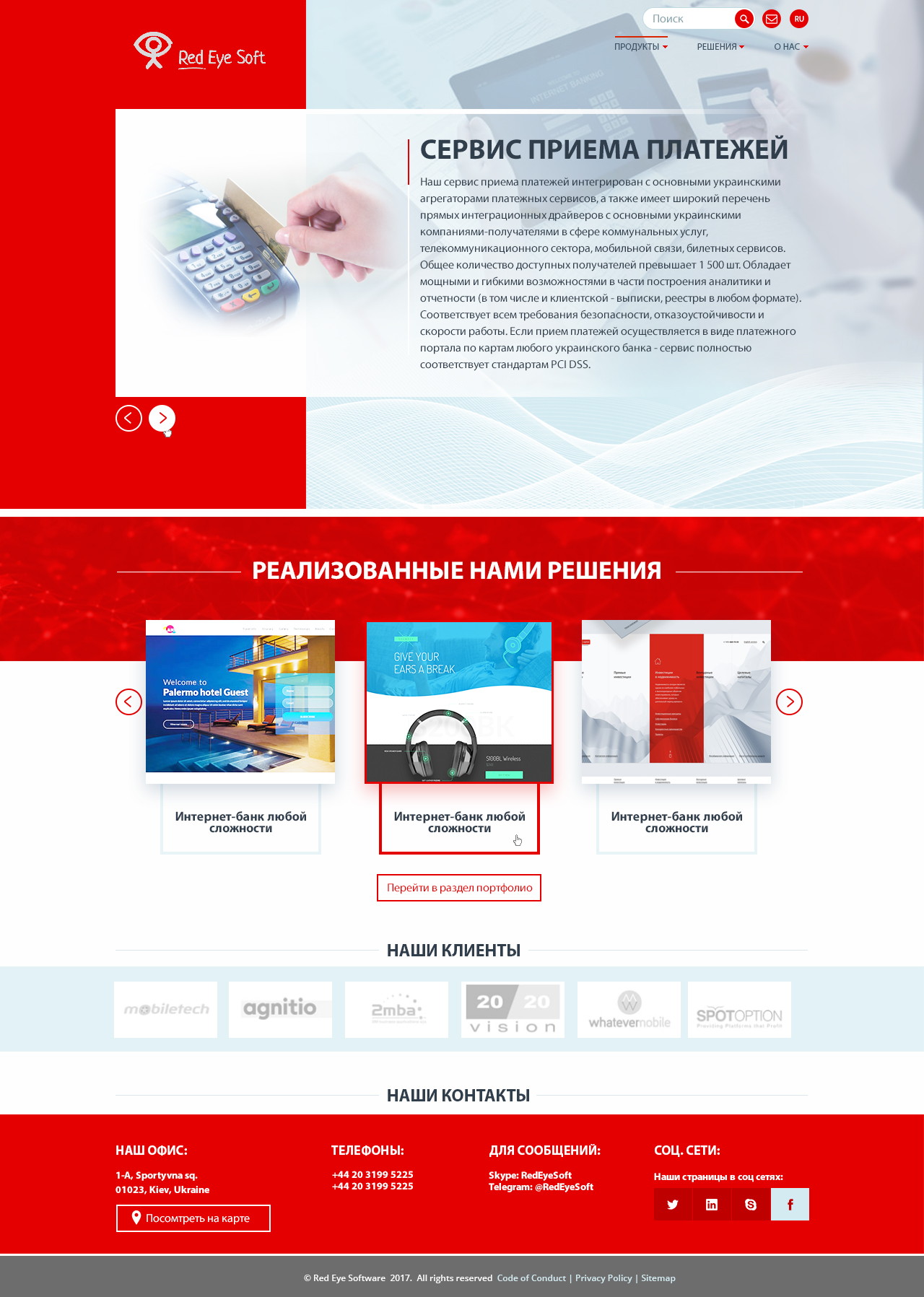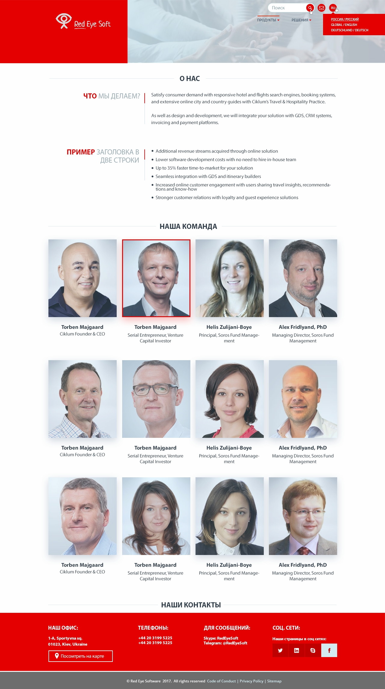 Интерфейс современный, акцентированный на технологиях, услугах и команде.