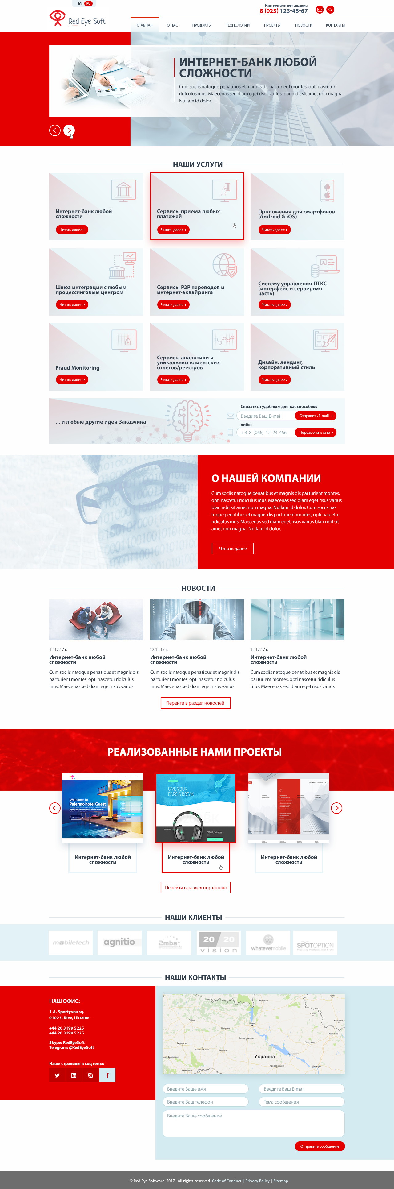 Интерфейс современный, акцентированный на технологиях, услугах и команде.