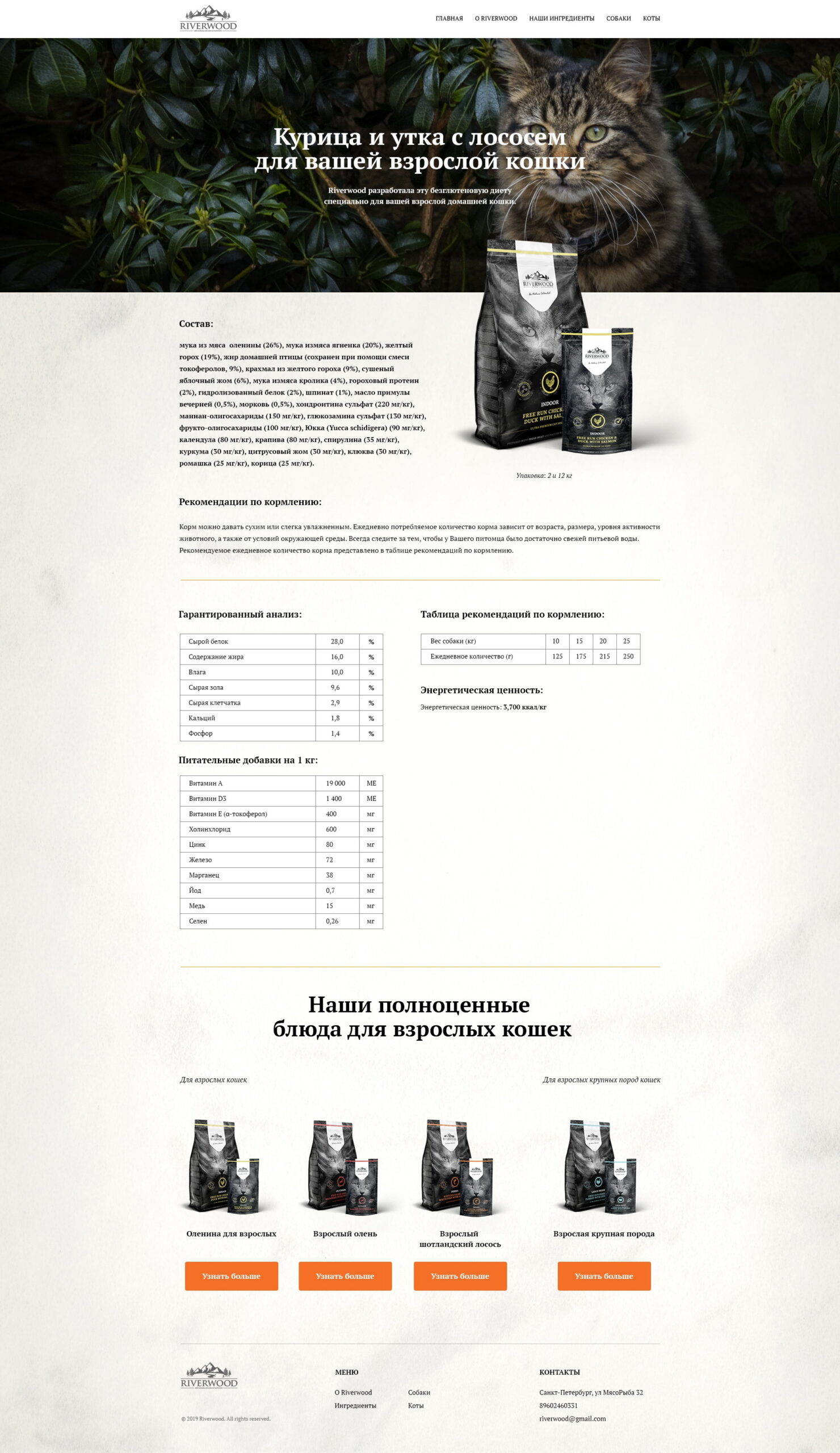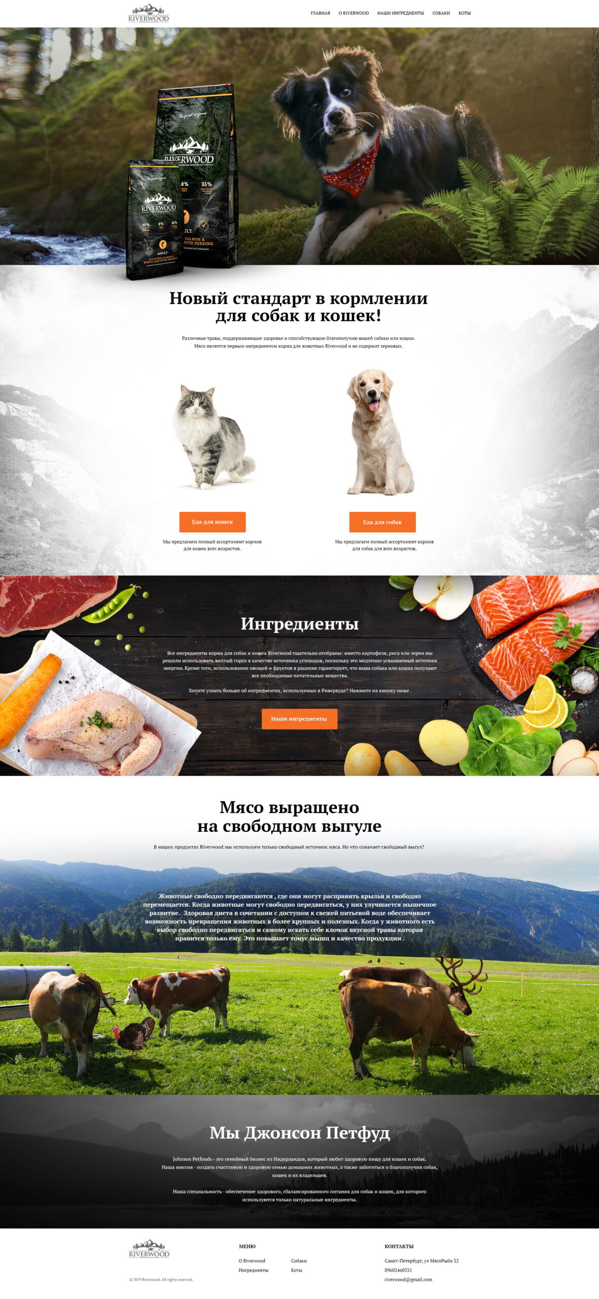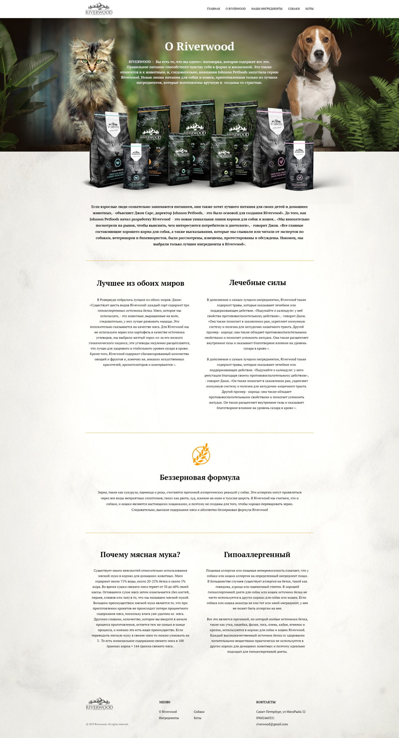 Сайт был разработан на Tilda для бренда натуральных кормов Riverwood. Основная задача — подчеркнуть экологичность продукции и доверие к бренду, поэтому ключевым элементом дизайна стали природные фотографии и акцент на зелёной палитре. Зелёный цвет ассоциируется со здоровьем и натуральностью, жёлтый добавляет энергии и тепла, а белые пространства обеспечивают лёгкость восприятия.