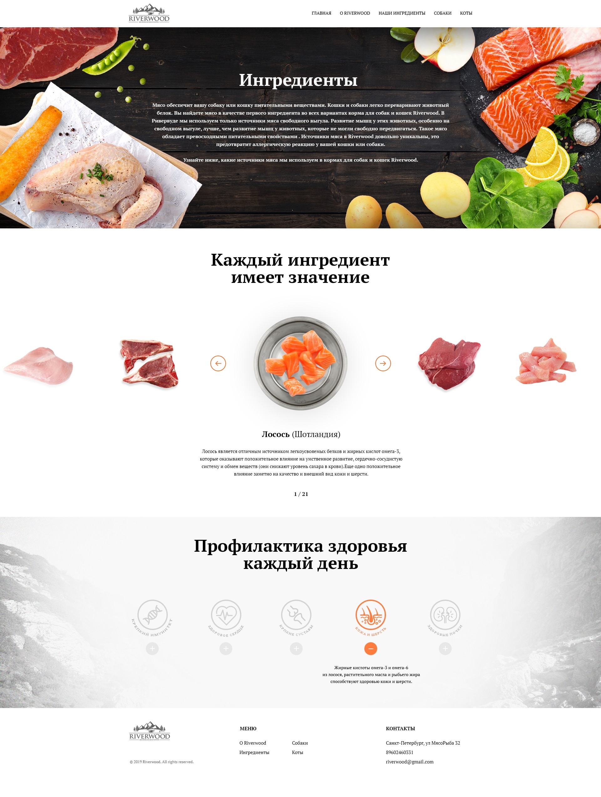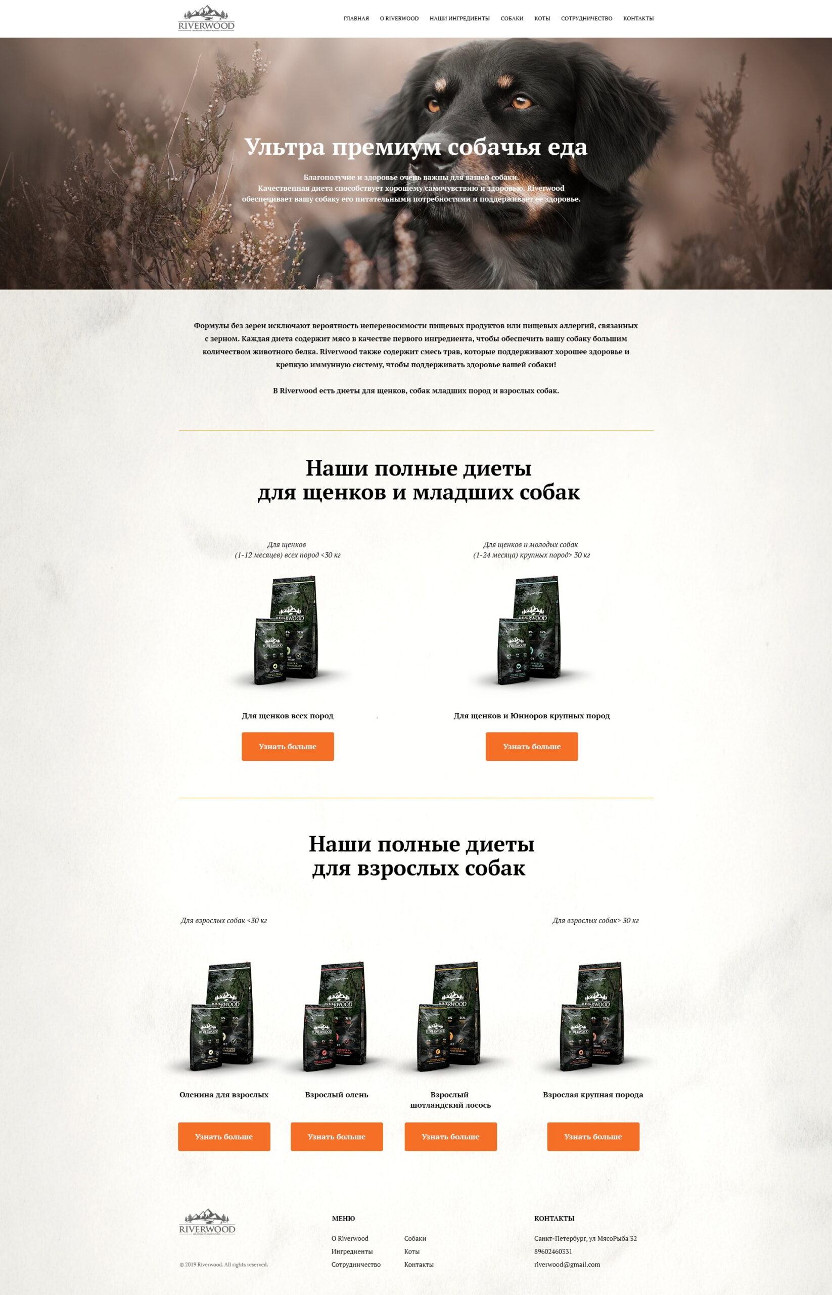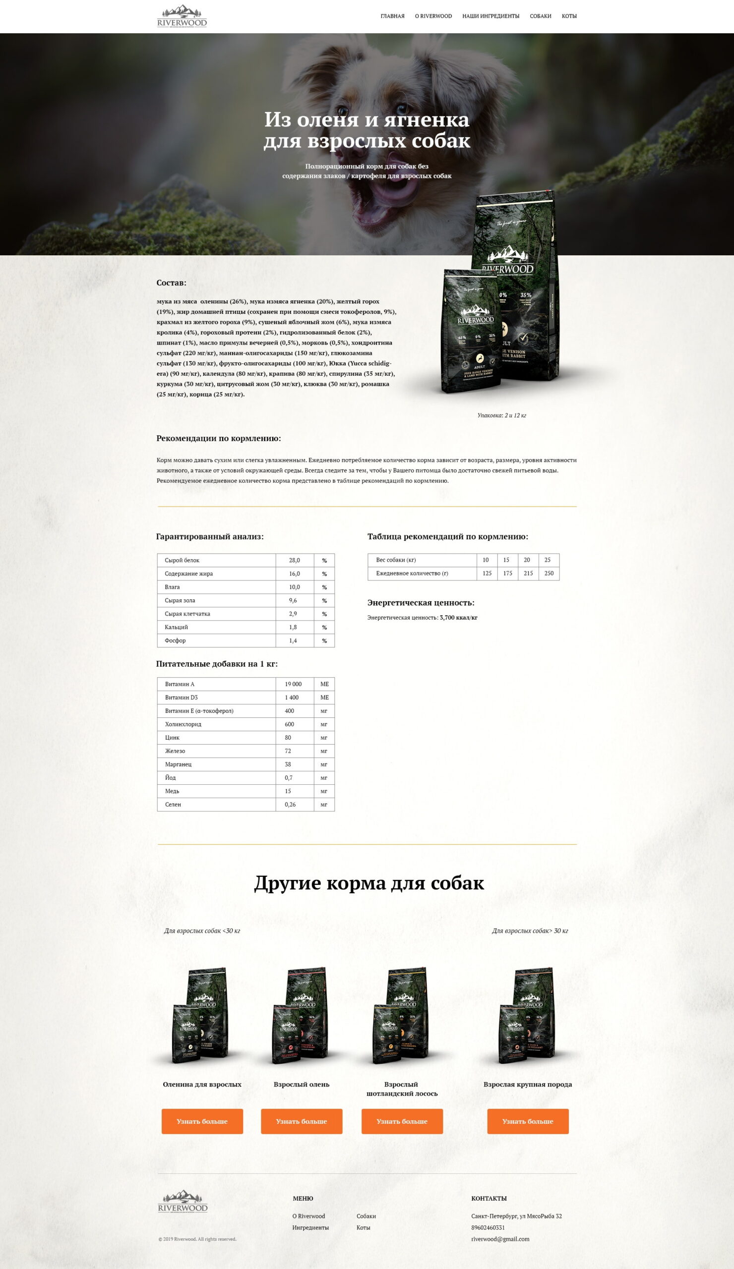 Сайт был разработан на Tilda для бренда натуральных кормов Riverwood. Основная задача — подчеркнуть экологичность продукции и доверие к бренду, поэтому ключевым элементом дизайна стали природные фотографии и акцент на зелёной палитре. Зелёный цвет ассоциируется со здоровьем и натуральностью, жёлтый добавляет энергии и тепла, а белые пространства обеспечивают лёгкость восприятия.