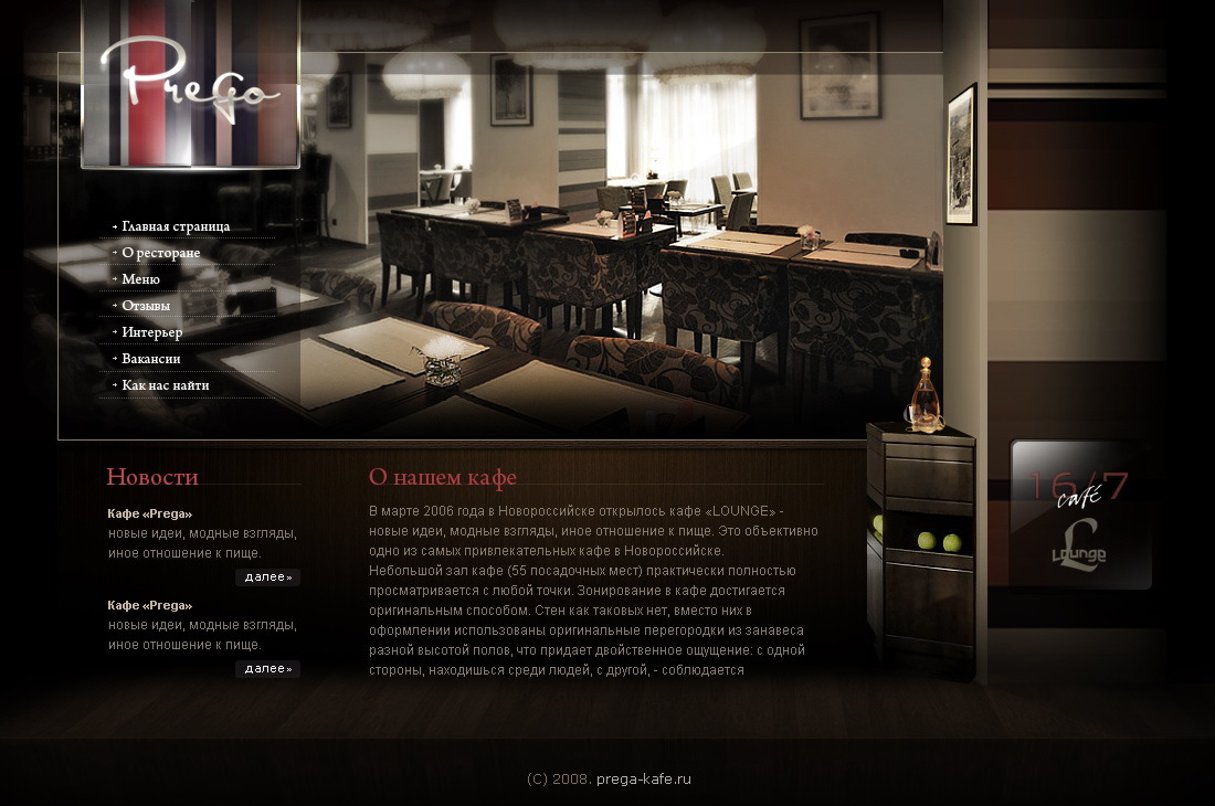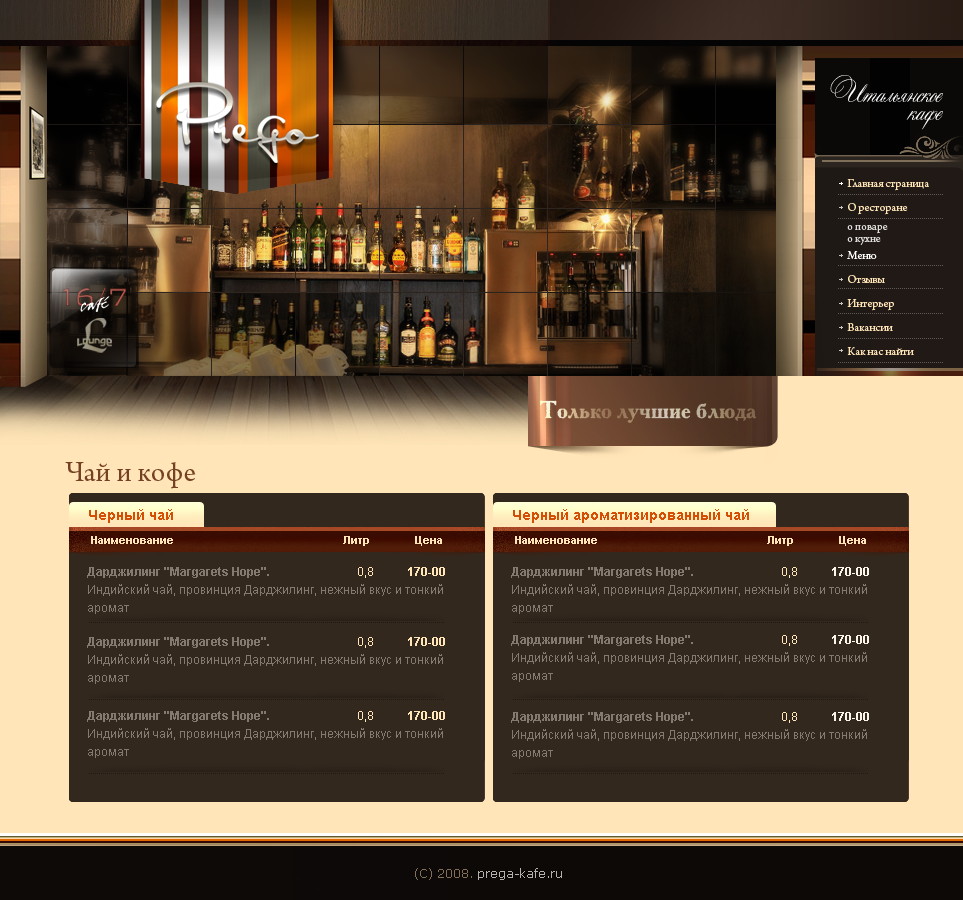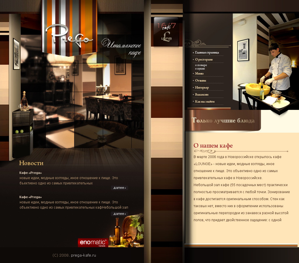 Для итальянского кафе «Prega» был создан атмосферный сайт с тёплой колористикой, передающей уют традиционных тратторий. Тёмно-коричневые и кирпичные оттенки создают ощущение аутентичности и подчёркивают характер кухни, а бежевый и жёлтый добавляют комфорта.