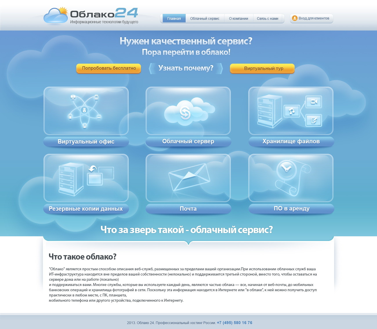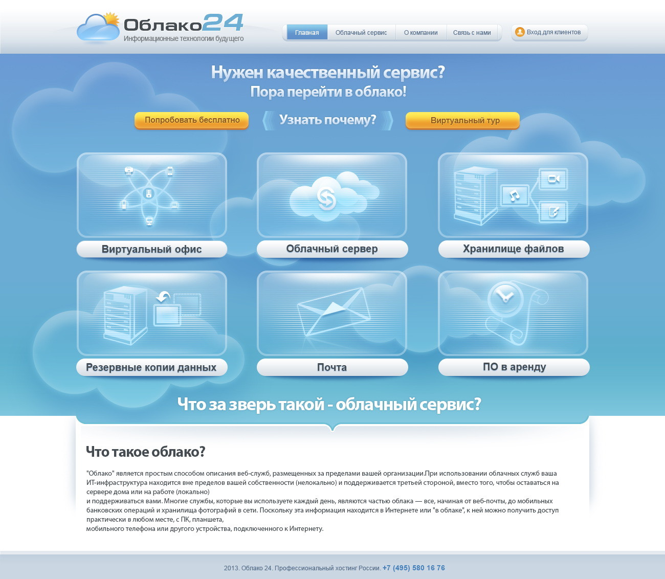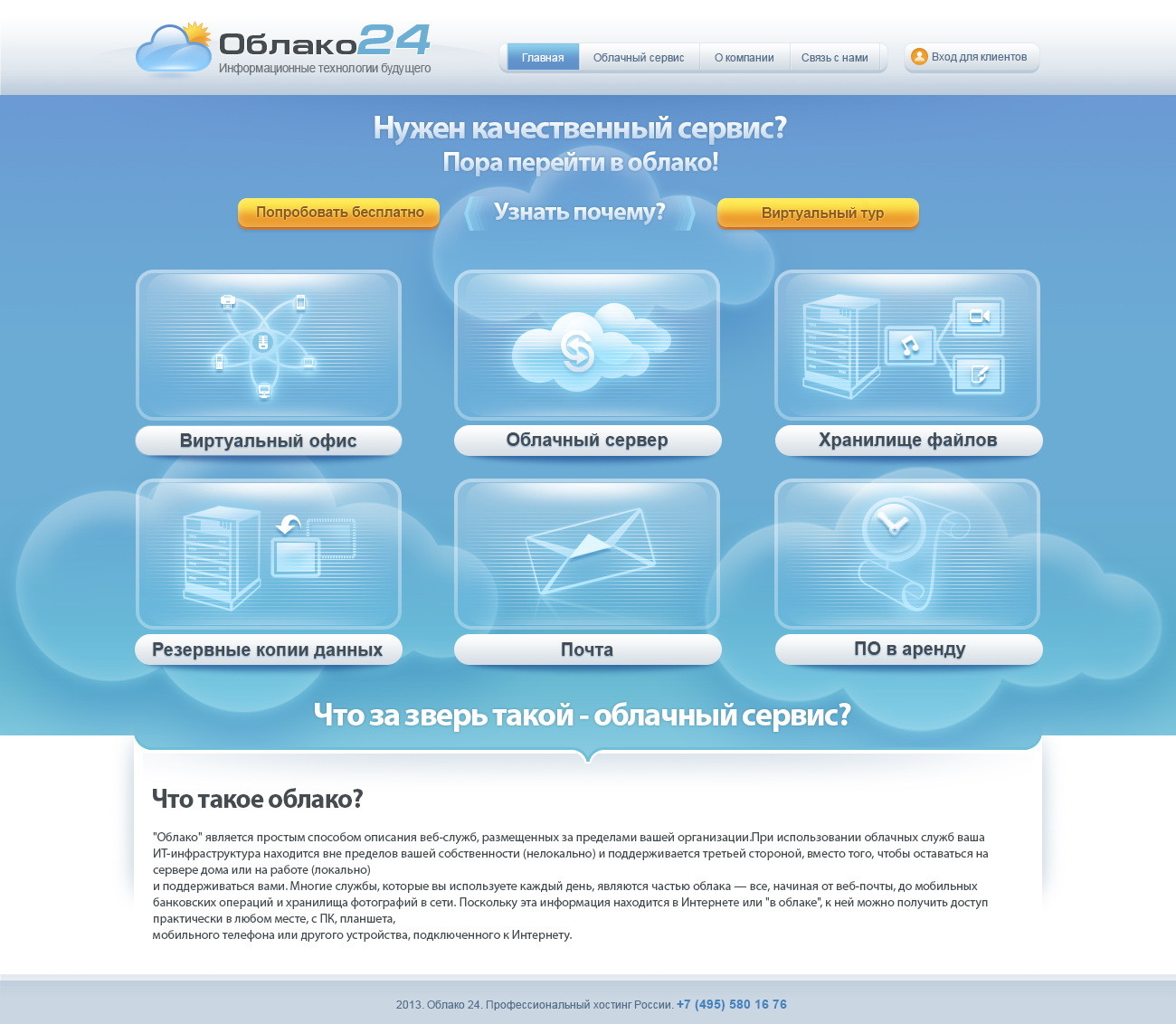 Разработано дизайнерское оформление сайта для сервиса облачного хостинга.