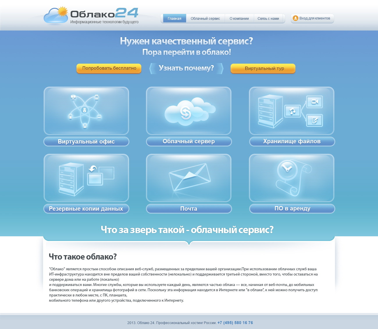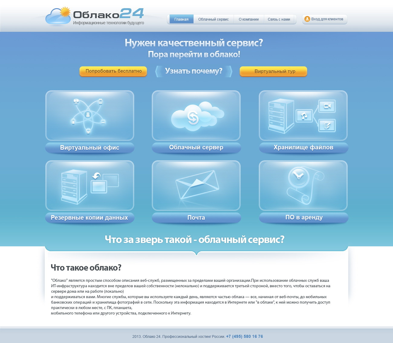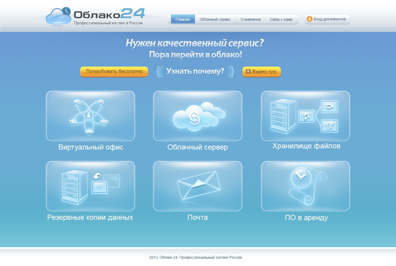 Разработано дизайнерское оформление сайта для сервиса облачного хостинга.