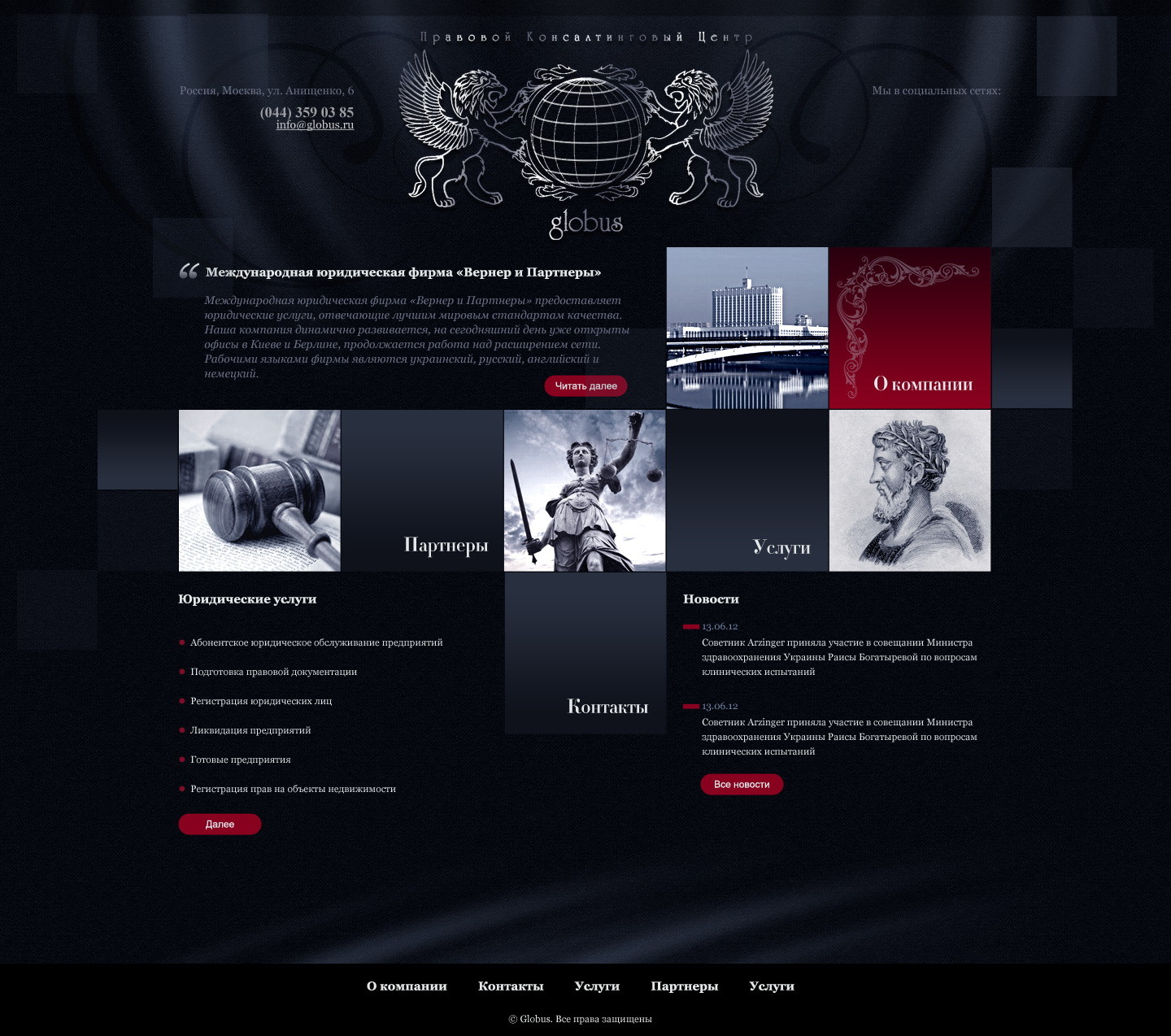 Визуальная палитра — тёмно-синий, бордовый и серебристый — формирует серьёзный, солидный стиль.