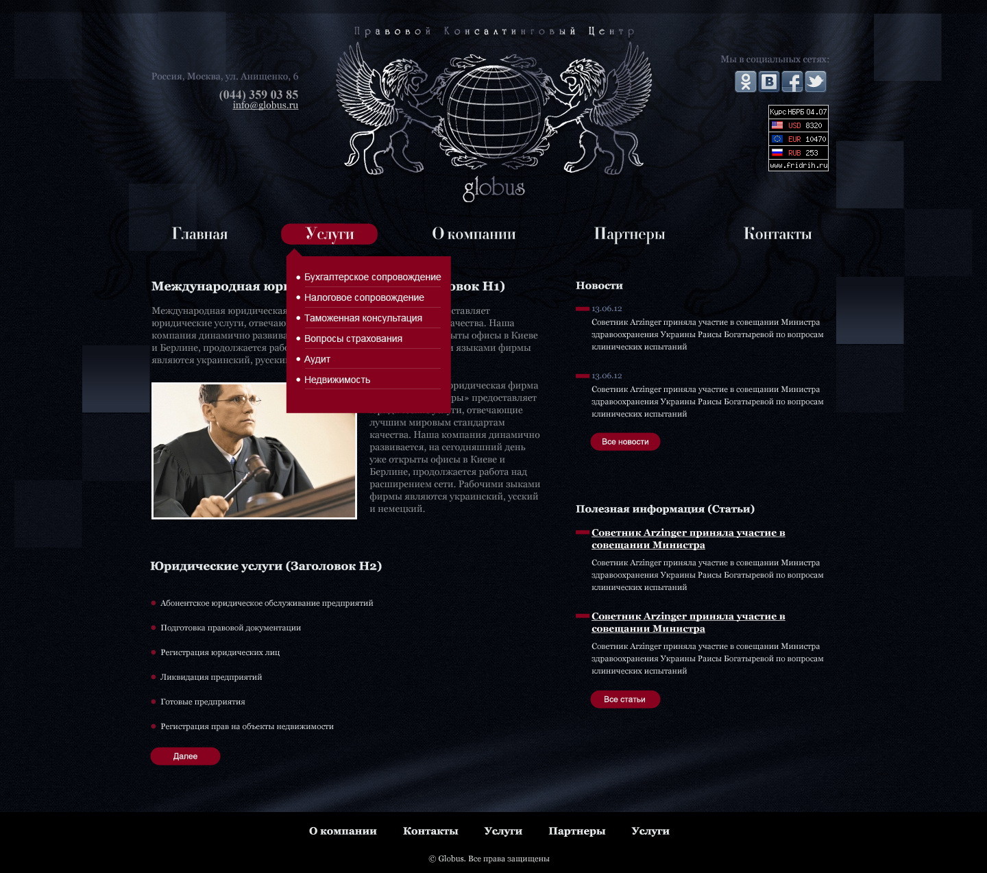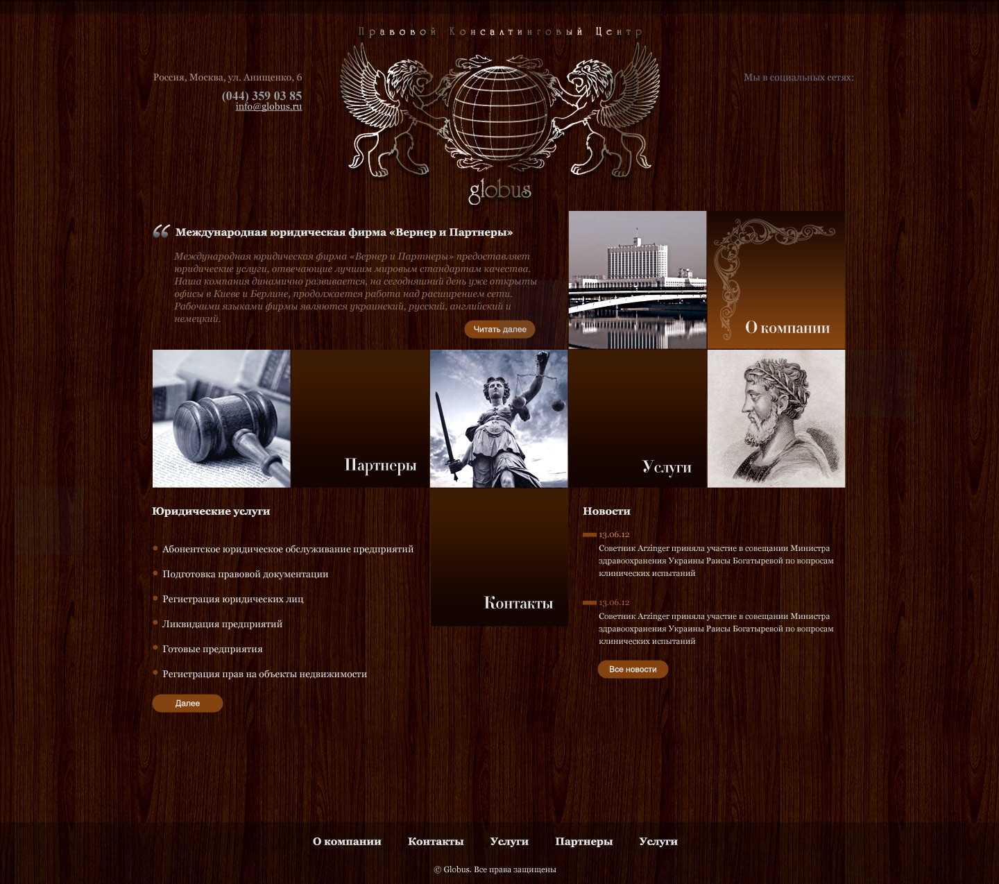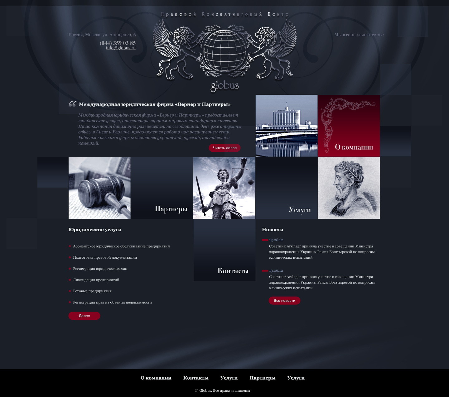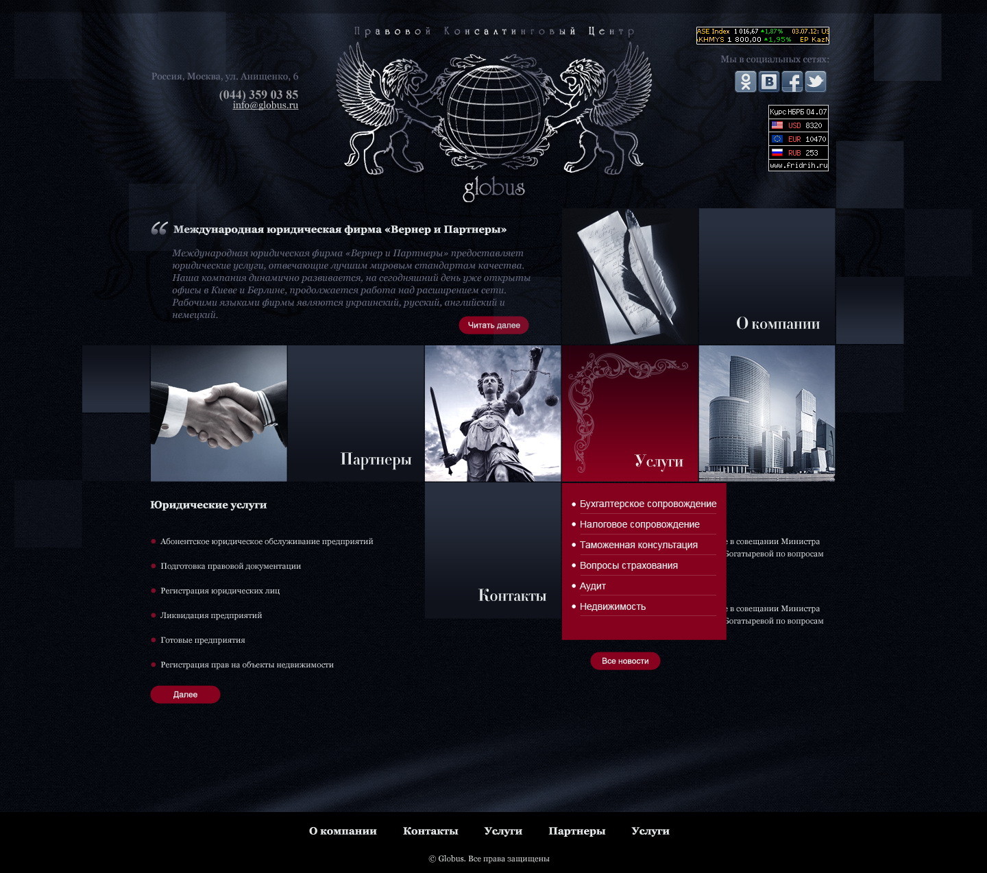 Дизайн подчёркивает юридическую надёжность, структурированность услуг и профессионализм. Сайт выполнен с акцентом на доверие и чёткость информации.