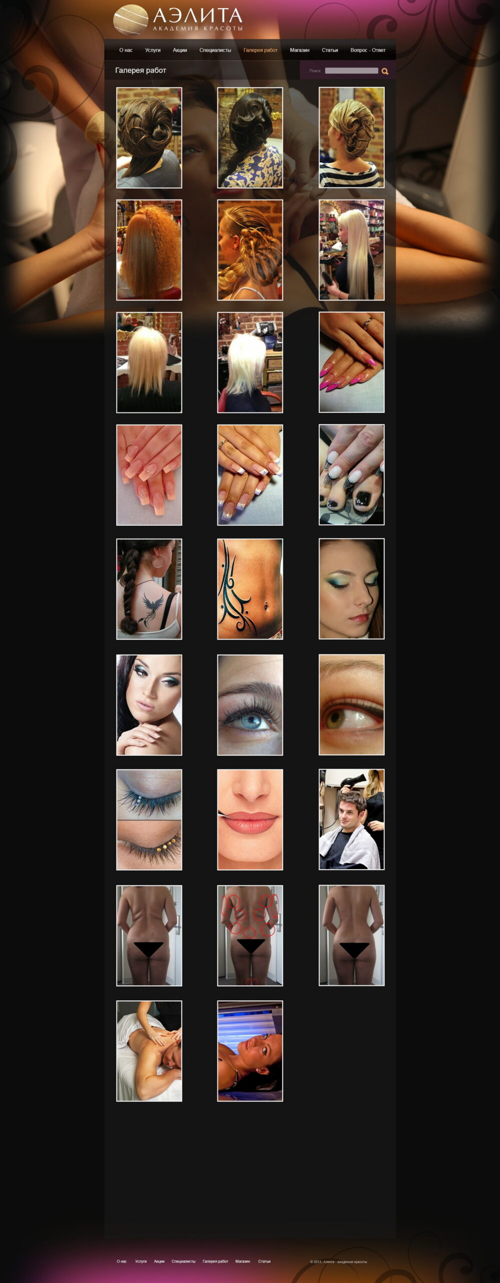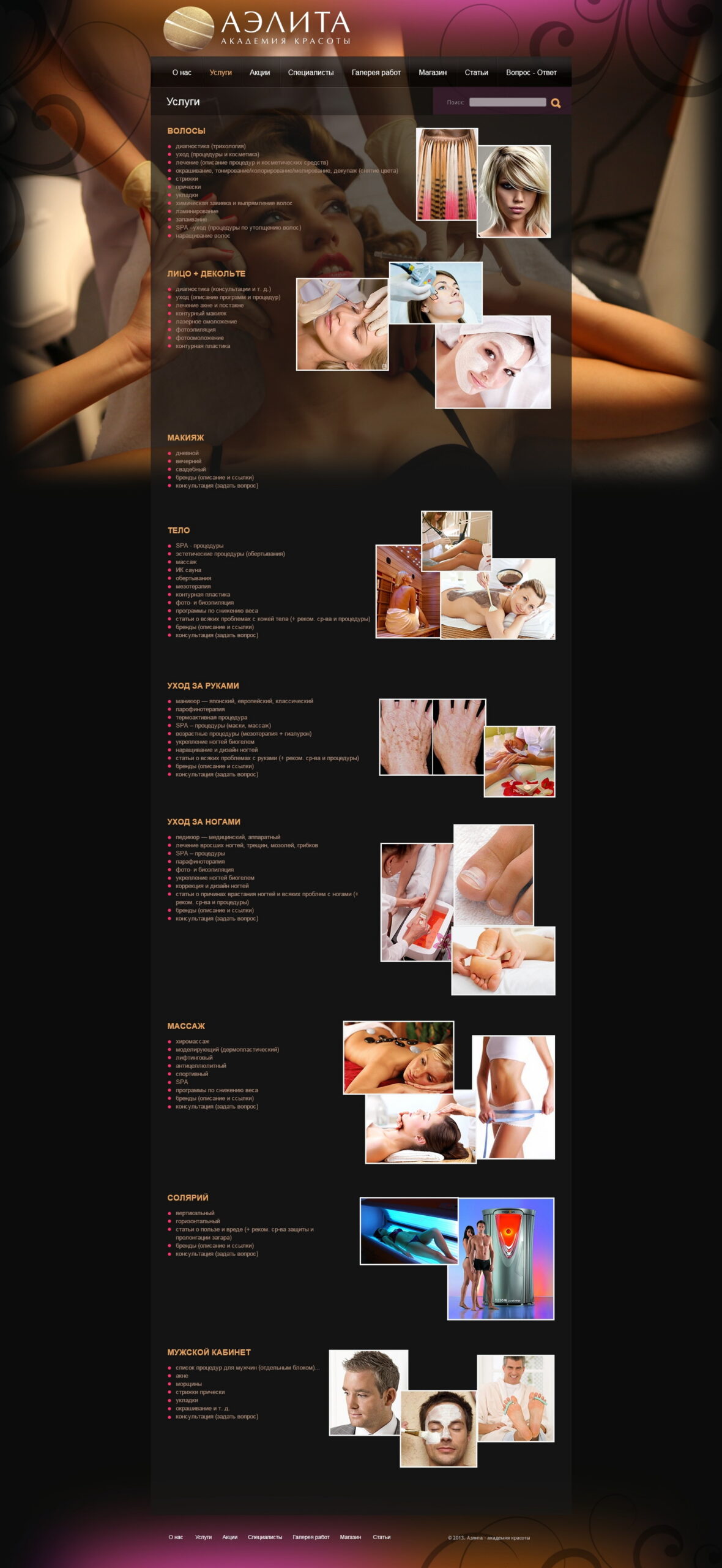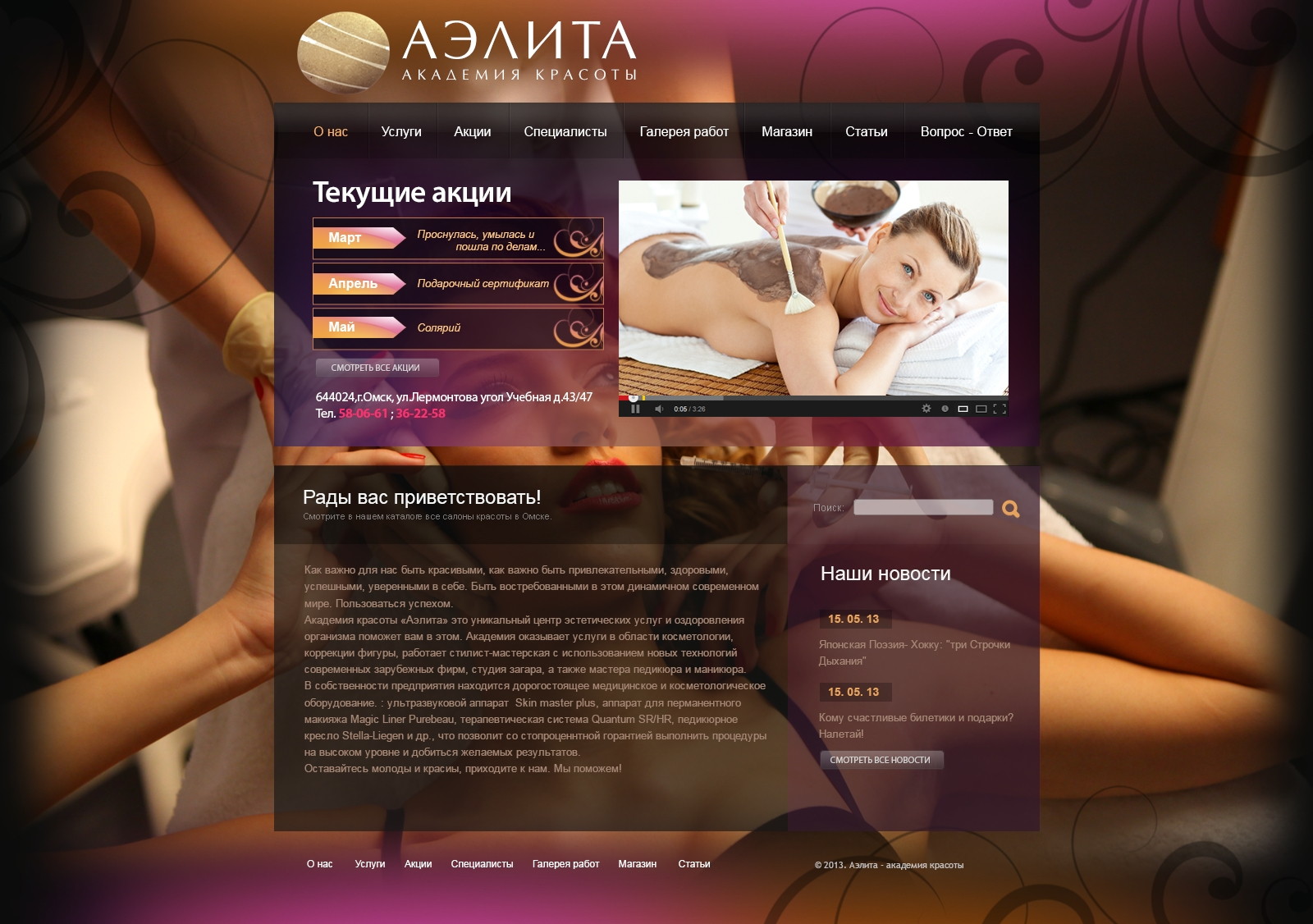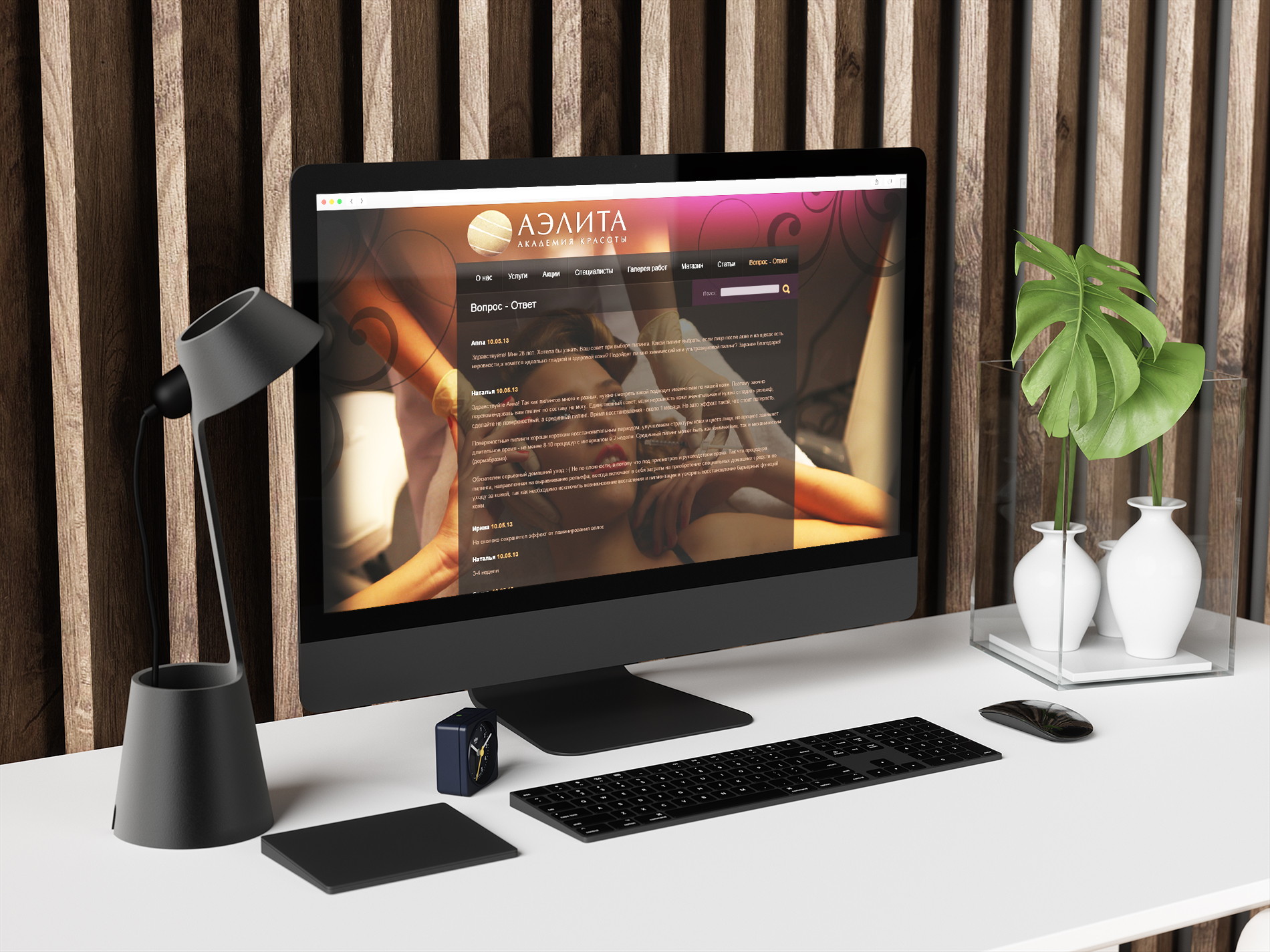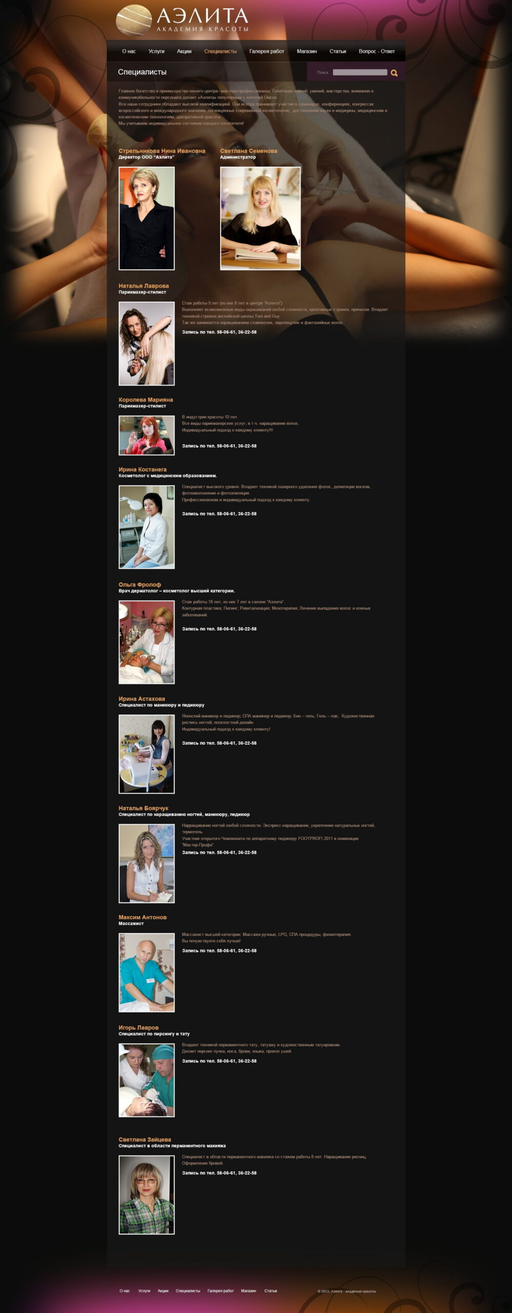 Дизайн сайта для Академии красоты «Аэлита» выполнен в стильной и элегантной палитре. Чёрный цвет подчеркивает премиальность, фиолетовый создаёт ассоциации с эстетикой и творчеством, а светло-коричневые оттенки добавляют мягкости и женственности. Такой баланс делает сайт привлекательным как для потенциальных учениц, так и для партнёров академии.